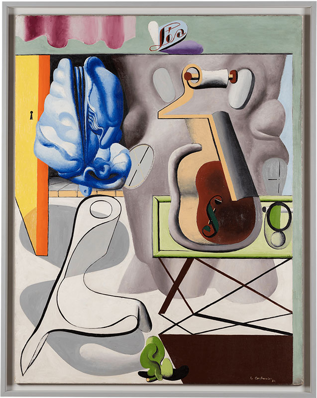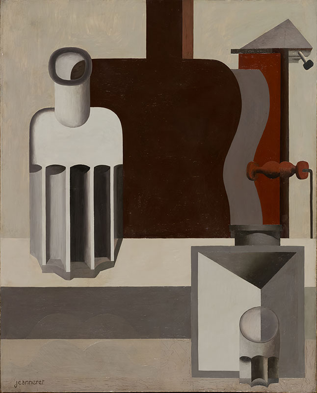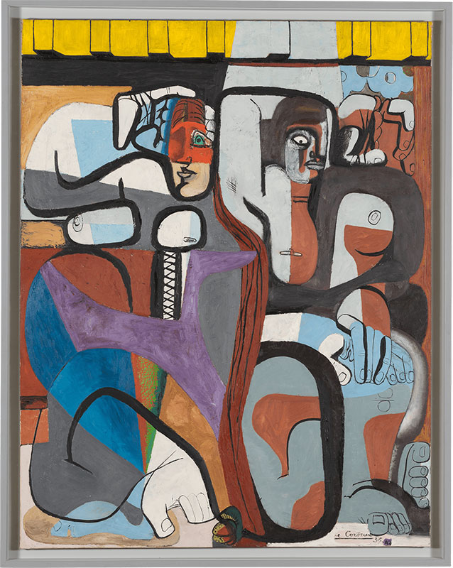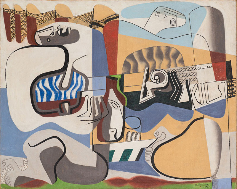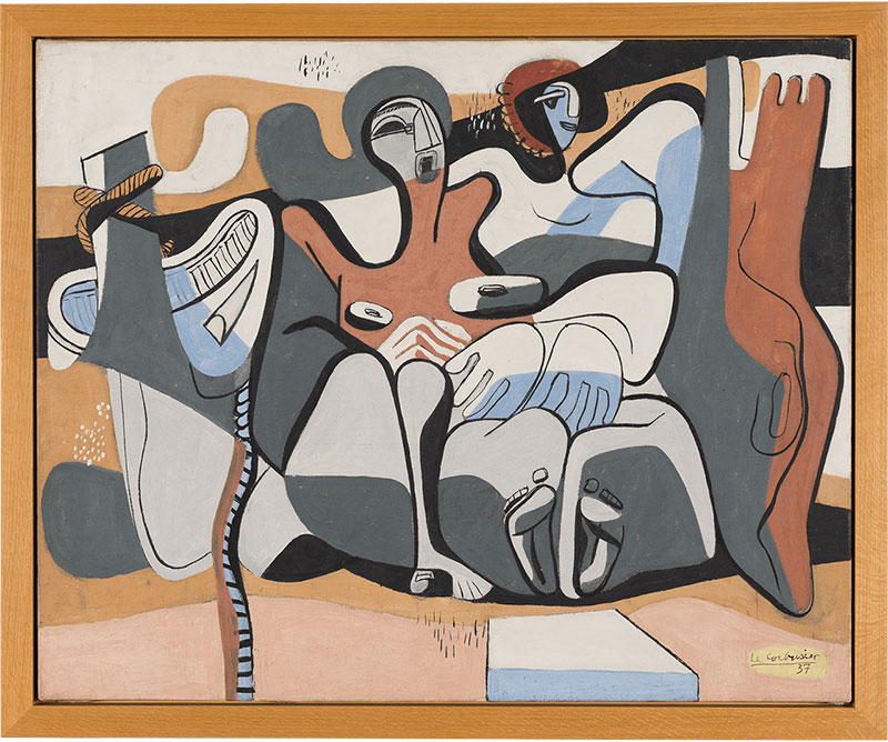 ル・コルビュジエは建築家でありながら、生涯多くの絵画作品を手掛けた画家でもありました。故郷ではみずみずしいスイスの風景を描いていました。パリに出て画家アメデ・オザンファンと出会い、1920年代前半は純粋な幾何学的形態を描く「ピュリスム」の活動を行い、1920年代末からはシュルレアリスムの影響を受けた作品や、「詩的な感情を喚起する静物」と呼んだ骨や石のようなオブジェを描く時期を経て、1930年代以降は女性を主たるテーマとして作品を制作します。第二次世界大戦後には、美術の潮流とは離れて、「牡牛」「イコン」といったテーマや、自作のキャラクターのような象徴的なモチーフを描くようになりました。