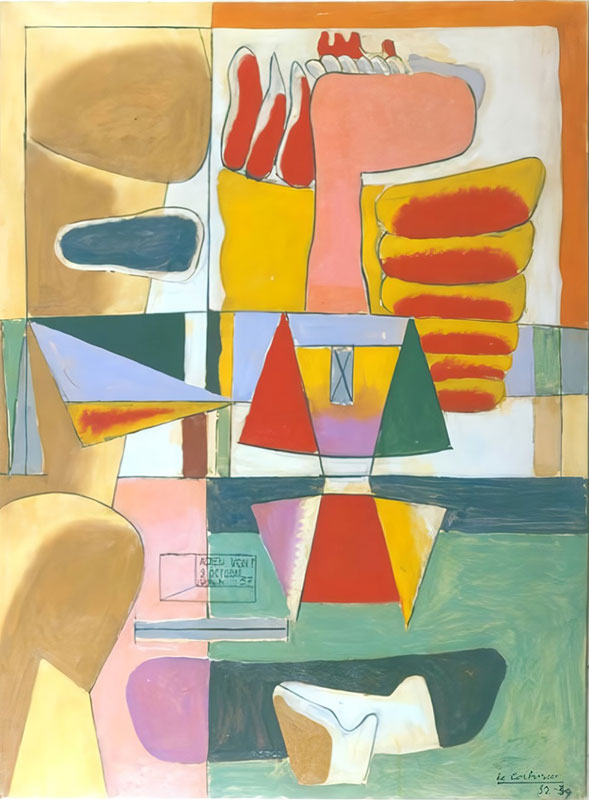 1920年代の禁欲的な卓上の静物画から、豊満な女性のヌードを描くにつれ、単なる幾何学的抽象ではなく、ル・コルビュジエ独特の肥痩のある線で描かれたフォルムへの変化は、彼の建築でも見られる形態表現の変化に対応しています。また、穏やかな彩度の低い色で構成された1920年代の絵画作品と《ラ・ロッシュ+ジャンヌレ邸》や《ワイセンホーフ・ジードルングの住宅》などで見られるポリクロミー、そして、強い色彩を効果的に用いた戦後の絵画作品と《マルセイユのユニテ・ダビタシオン》やチャンディガールの建築は、見事に対応しています。このように、彼の絵画と建築とは密接な関係があり、制約が多い建築と違って、自由に表現ができる絵画で行ったさまざまな試みが、建築へ反映されていたといえます。彼にとって絵画は一種の実験室でした。