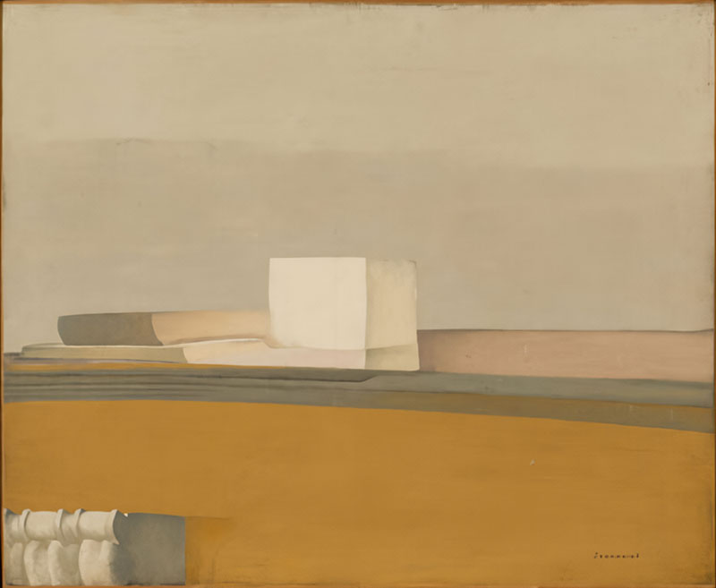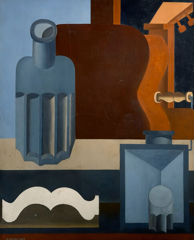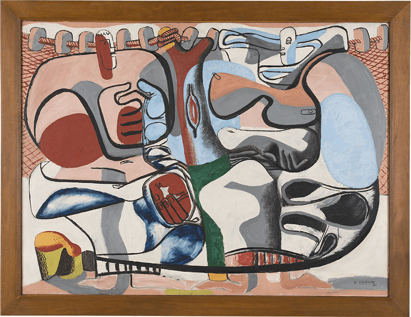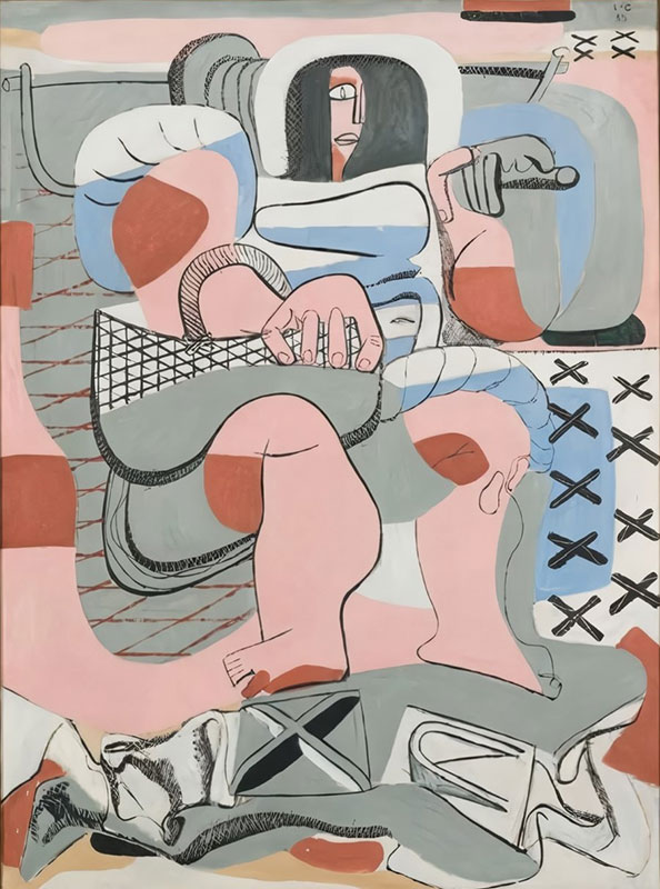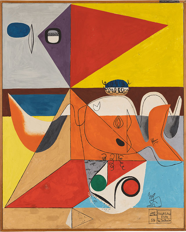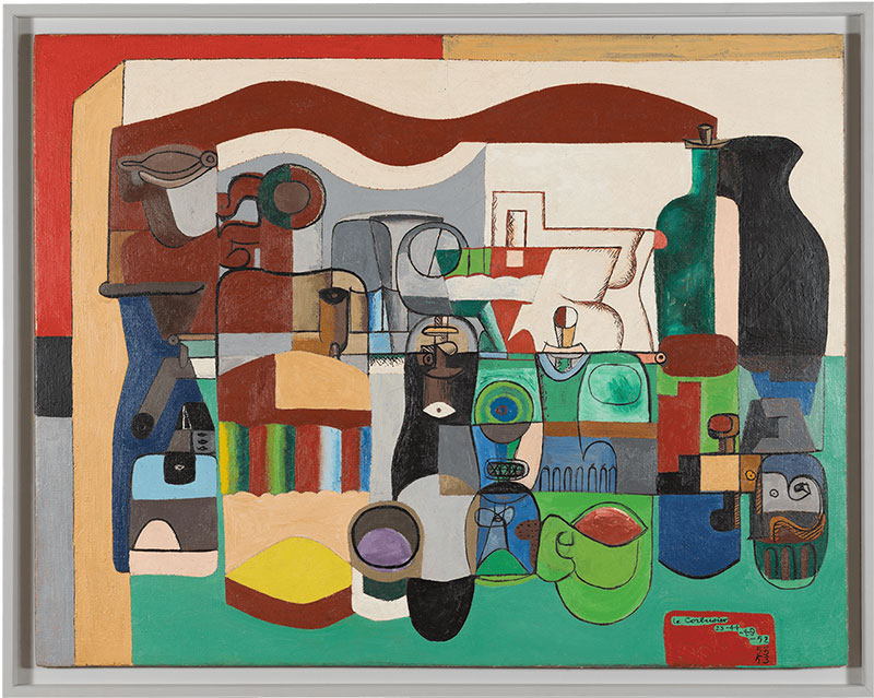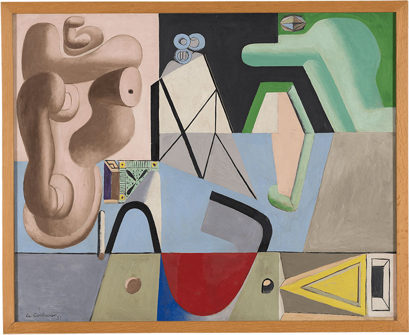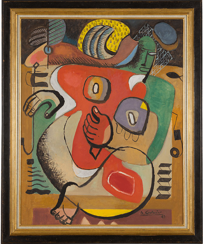 ル・コルビュジエは建築家でありながら、生涯多くの絵画作品を手掛けた画家でもありました。故郷ではみずみずしいスイスの風景を描いていました。パリに出て画家アメデ・オザンファンと出会い、1920年代前半は純粋な幾何学的形態を描く「ピュリスム」の活動を行い、1920年代末からはシュルレアリスムの影響を受けた作品や、「詩的な感情を喚起する静物」と呼んだ骨や石のようなオブジェを描く時期を経て、1930年代以降は女性を主たるテーマとして作品を制作します。第二次世界大戦後には、美術の潮流とは離れて、「牡牛」「イコン」といったテーマや、自作のキャラクターのような象徴的なモチーフを描くようになりました。