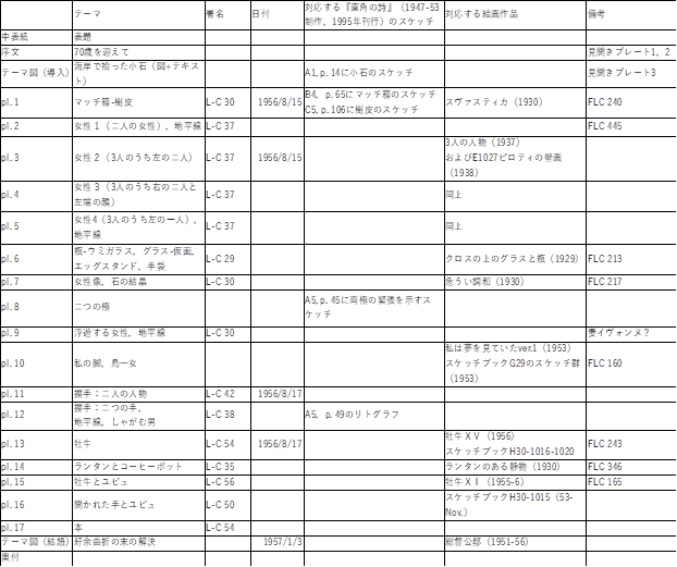 これを含めて『二つの間に』のテキストと版画で回帰するイメージ群は,1929年に遡る解体されたマッチ箱や変形されたグラスや瓶,同時期に油彩画のモチーフに加わった〈詩的感動を喚起するオブジェ〉と呼ばれる小石や樹皮,追いかけるように禁止を解かれ復活した〈女性〉イメージに留まらない.空っぽの手袋を経て二者の結合を象徴する握手,第2次世界大戦後に誕生した<牡牛>のイメージやユビュ,開かれた手へと広がっている.中でも戦後のイメージは,いずれも独自のシルエットを持って誕生し,その後に彼の絵画作品で反復されることになる.付け加えるなら,版画プレート2,5,9,12に描かれた地平線も見逃せない.それは,彼が形成期に遭遇し至上の建築とみなしたアクロポリスあるいはパルテノン神殿に見出した幾何学的秩序の象徴である.